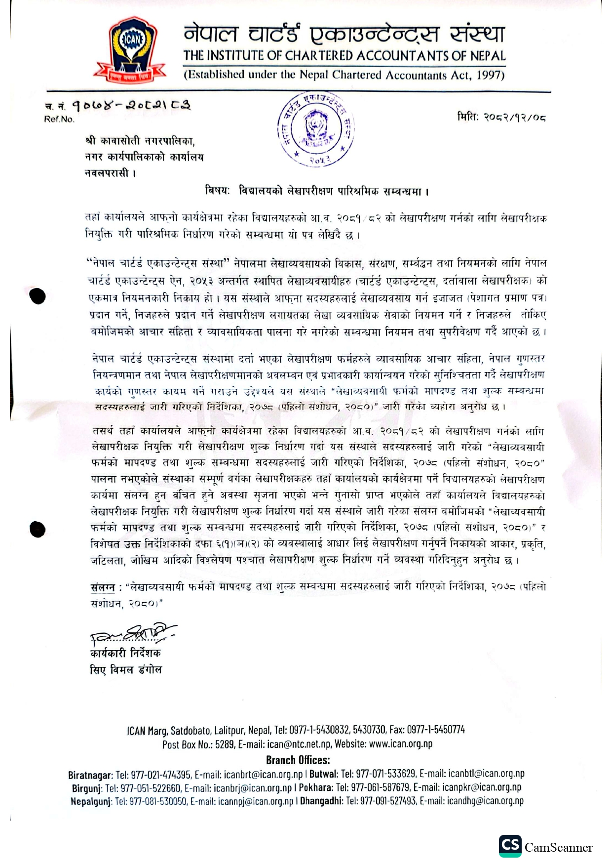 नवलपरासी (बर्दाघाट सुस्ता पूर्व) अन्तर्गत कावासोती नगरपालिकामा सामुदायिक विद्यालयहरूको लेखापरीक्षणका लागि तोकिएको दररेट नेपाल चार्टर्ड एकाउन्टेन्ट्स संस्था (ICAN) को निर्देशिका भन्दा न्यून रहेको विषयमा अडान जिल्ला कार्यसमिति (नवलपरासी – बर्दाघाट सुस्ता पूर्व) ले उठाएको गुनासो सम्बन्धमा ICAN बाट जारी गरिएको पत्र सबैको जानकारीका लागि यसैसाथ संलग्न गरिएको छ।