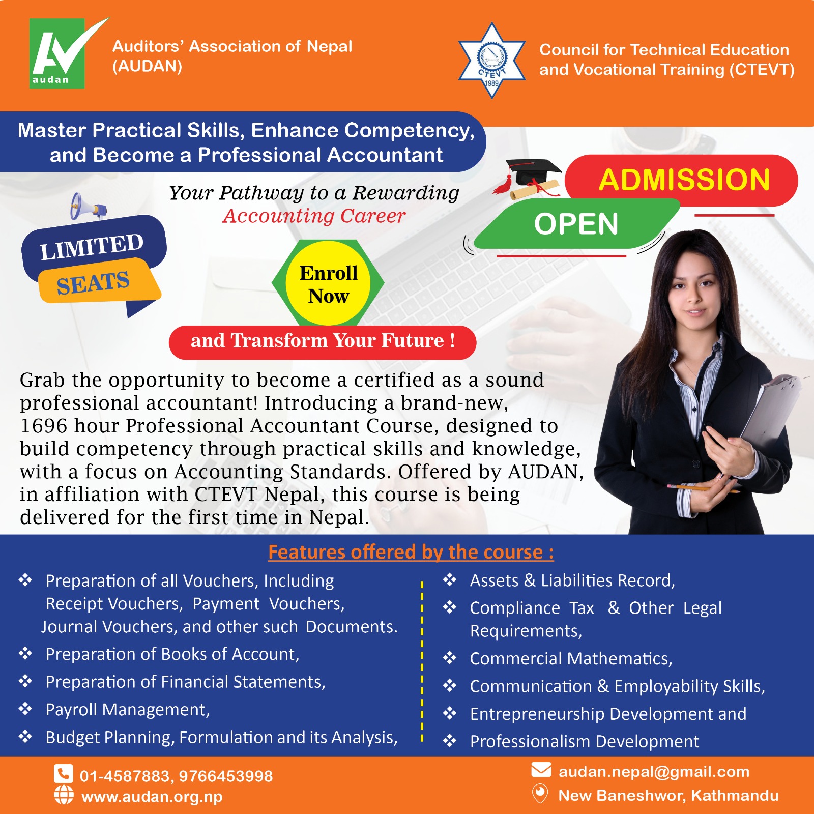 The Professional Accountant Course at AUDAN is a CTEVT-affiliated, competency-based program designed to equip aspiring accountants with the essential knowledge and practical skills needed to meet the demands of today’s market. This course offers an in-depth understanding of key accounting principles, financial reporting, taxation, and other legal requirements, with a strong focus on practical skill development and real-world experience. The main objective of this course is to enhance students' ability to prepare financial statements for Non-Profit Organizations (NPOs), Micro Entities (MEs), and Small and Medium-sized Enterprises (SMEs), based on Accounting Standards.