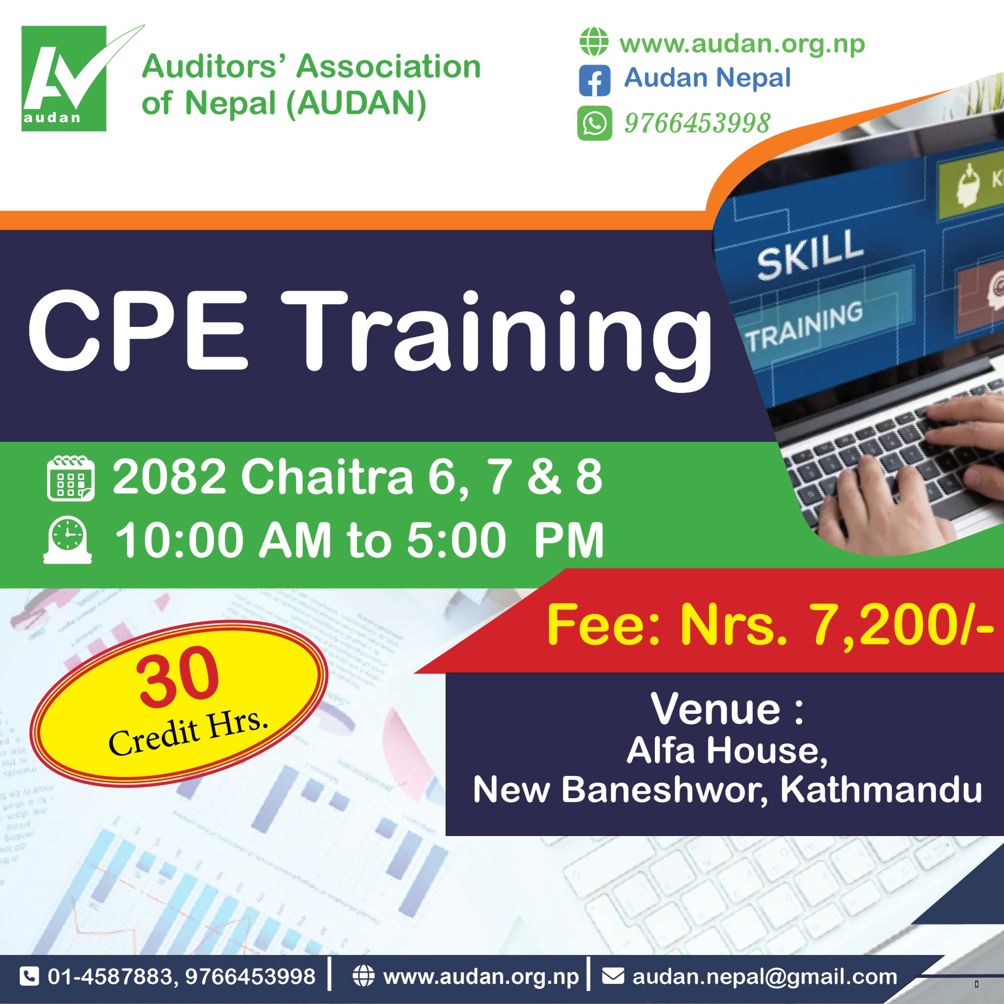 मिति २०८२ चैत्र ६, ७ र ८ गते काठमाडौंमा सी.पी.ई तालिम संचालन हुन गइरहेको हुँदा सहभागी सिट सिमित भएकोले अग्रिम नाम दर्ता गराई समयमै आफ्नो सिट सुरक्षित राख्नुहुन अनुरोध गरिन्छ । साथै लिंक भित्र दिईएको eSewa, IPS, Bank वा QR मध्ये कुनै १ माध्यमबाट सहभागि शुल्क दाखिला गरि सो को भौचर audan.education@gmail.com मा ईमेल गरिदिनुहुन अनुरोध गर्दछौं ।