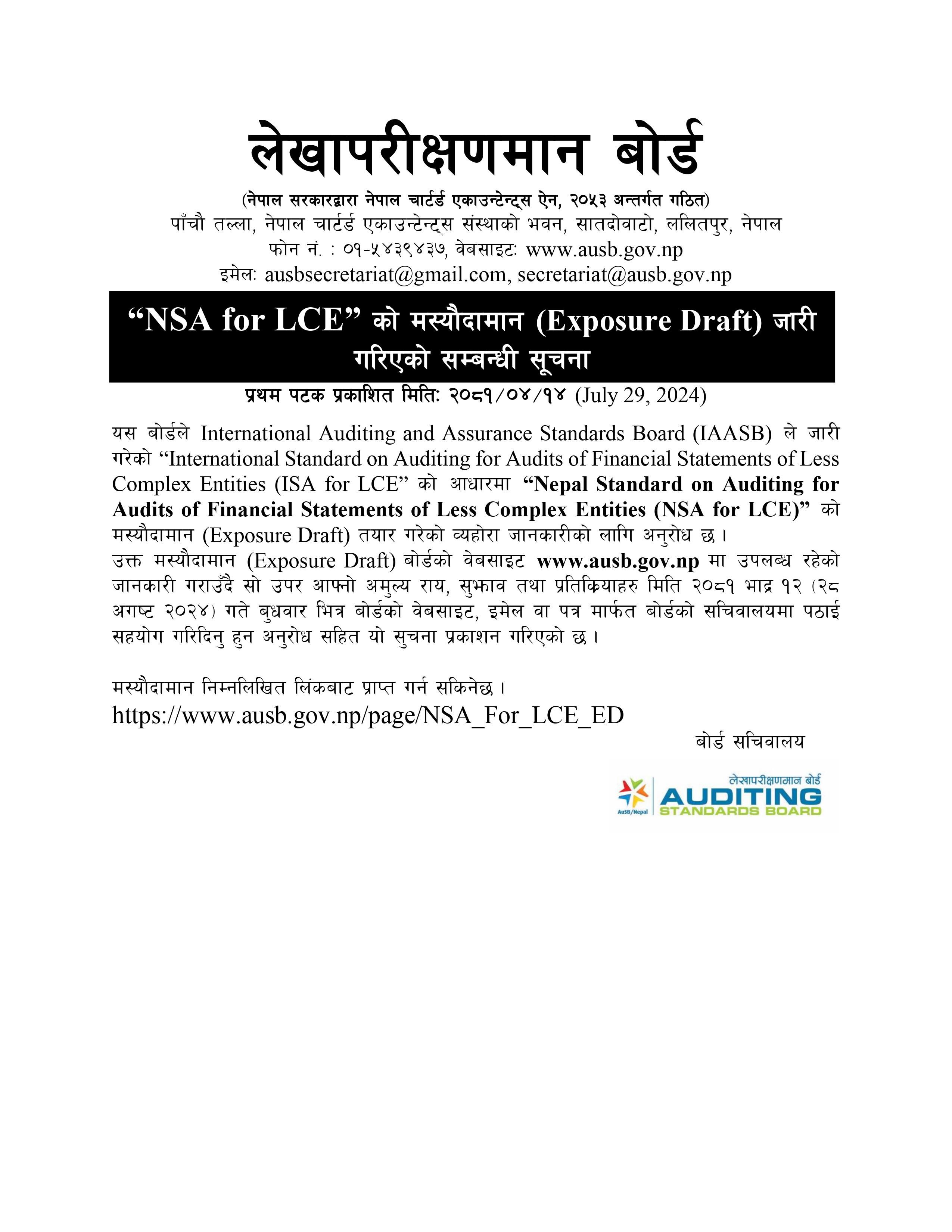 लेखापरीक्षणमान् बोर्डबाट जारी भएको “NSA for LCE” को मस्यौदामान सम्बन्धी यसै साथ संलग्न सूचनामा उल्लेख भए बमोजिम आफ्नो राय, सुझाव तथा प्रतिक्रिया दिनुहुन अनरोध छ ।