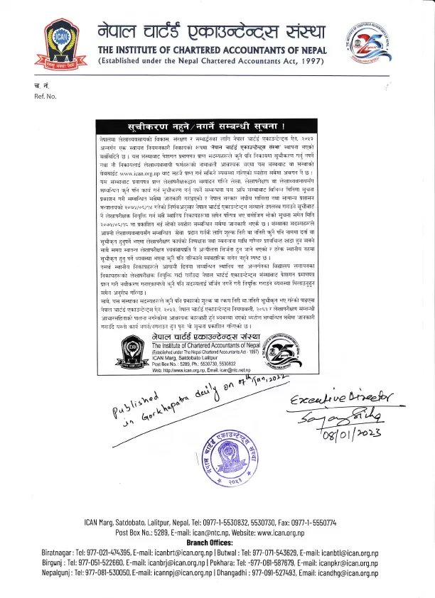 विगत केही वर्ष यता स्थानीय निकाय अन्तरगतका केहि पालिकाहरुले सामुदायिक विद्यालयहरुको लेखापरीक्षण कार्य गर्नका लागि नेपाल चार्टर्ड एकाउन्टेन्ट्स संस्था (ICAN) मा दर्ता भई नविकरण गरेका लेखापरीक्षकहरुबाट तोकिएको दस्तुर तिरेर सूचीकृत हुनको लागि सूचना प्रकाशन गरे बमोजिम केही लेखापरीक्षक साथीहरुले नेपाल चार्टर्ड एकाउन्टेन्ट्स संस्थाबाट जारी भएको सूचनालाई समेत बेवास्था गरी दस्तुर तिरेर सूचीकृत भई लेखापरीक्षण कार्य गरेकोले अब उप्रान्त त्यस्तो कार्य नगर्न नगराउन हुन जानकारीको लागि नेपाल चार्टर्ड एकाउन्टेन्ट्स संस्थाले मिति २०७९ पौष २३ गते पुनः सूचना प्रकाशित गरेकोले सम्बन्धित सबै सरोकारवालाको जानकारीको लागि यो सूचना प्रवाह गरिएको छ ।