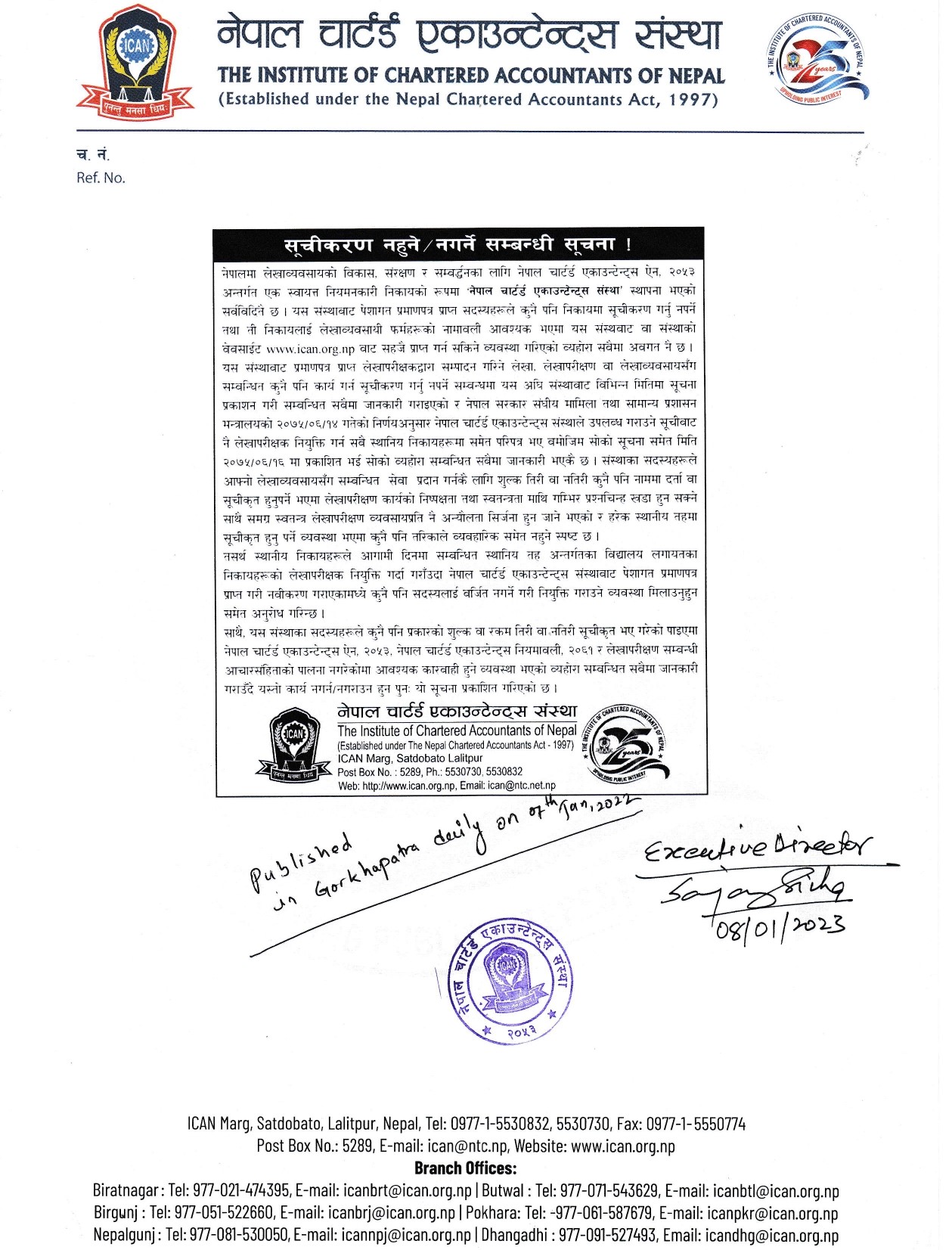 विगत केही वर्ष यता स्थानीय निकाय अन्तरगतका केहि पालिकाहरुले सामुदायिक विद्यालयहरुको लेखापरीक्षण कार्य गर्नका लागि नेपाल चार्टर्ड एकाउन्टेस्टस संस्था (ICAN) मा दर्ता भई नविकरण गरेका लेखापरीक्षकहरुबाट तोकिएको दस्तुर तिरेर सूचीकृत हुनको लागि सूचना प्रकाशन गरे बमोजिम केही लेखापरीक्षक साथीहरुले नेपाल चार्टर्ड एकाउन्टेस्टस संस्थाबाट जारी भएको सूचनालाई समेत बेवास्था गरी दस्तुर तिरेर सूचीकृत भई लेखापरीक्षण कार्य गरेकोले अब उप्रान्त त्यस्तो कार्य नगर्न नगराउन हुन जानकारीको लागि नेपाल चार्टर्ड एकाउन्टेस्टस संस्थाले मिति २०७९ पौष २३ गते पुनः सूचना प्रकाशित गरेकोलेसम्बन्धित सबै सरोकारवालाको जानकारीको लागि यो सूचना प्रवाह गरिएको छ ।