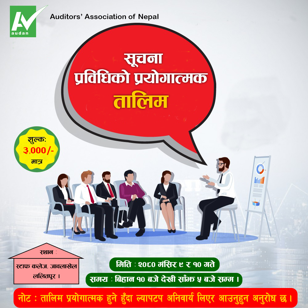 Practical Training on Information Technology (IT) Training from 2080 Mangsir 9 to 10 at 10 AM to 5 PM in Staff College, Jawalakhel, lalitpur. Fee : 3,000/-. Contact : 01-4587883, 9766453998, 9849997068, 9817126842. It is compulsory to bring your own Laptop for the training.